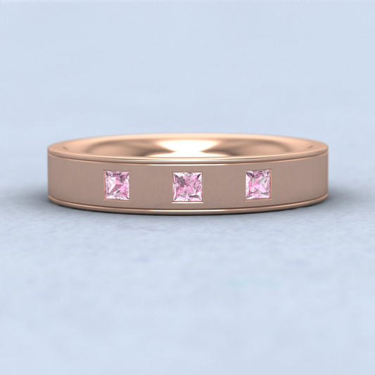 Princess Cut Pink Sapphire And Line Patterned 18ct Rose Gold 4mm Wedding Ring