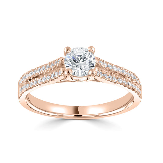 18ct Rose Gold Four Claw Diamond Ring With Milgrain And Diamond Shoulders