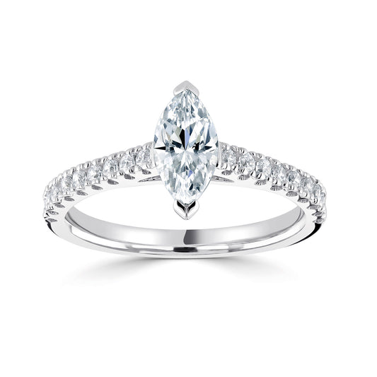 18ct White Gold Claw Set Marquise Diamond And Pave Shoulder Set Ring