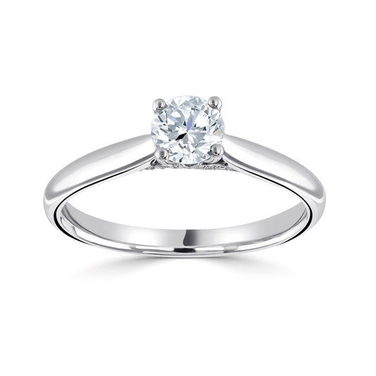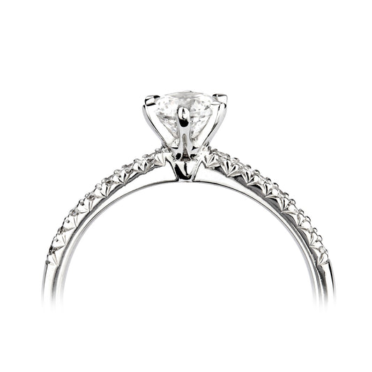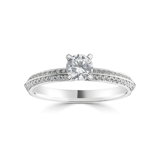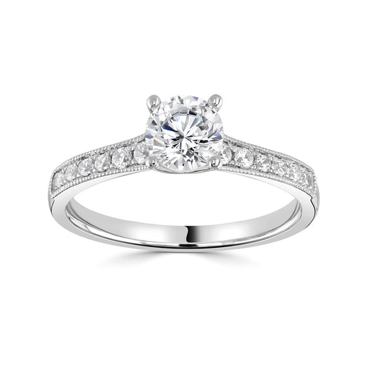 18ct White Gold Four Claw Diamond Ring With Milgrain And Diamond Shoulders