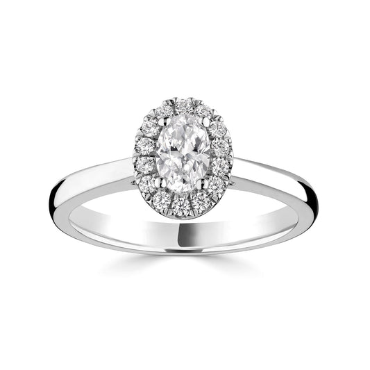 18ct White gold Oval Halo Style Diamond Ring, Plain shoulders