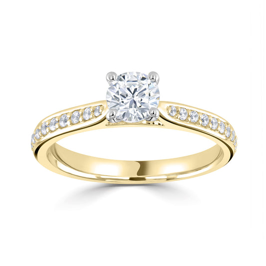 18ct Yellow Gold And Platinum Six Claw Diamond Ring With Diamond Shoulders