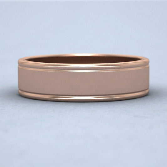 Rounded Edge Grooved Pattern Flat 18ct Rose Gold 6mm Flat Wedding Ring