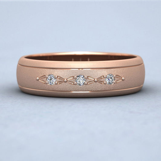 Three Diamond Set 18ct Rose Gold 6mm Wedding Ring With Lines