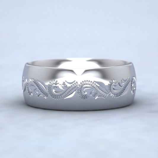 Engraved Court Shape 18ct White Gold 8mm Wedding Ring