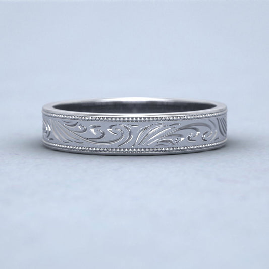 Engraved 9ct White Gold 4mm Flat Wedding Ring With Millgrain Edge
