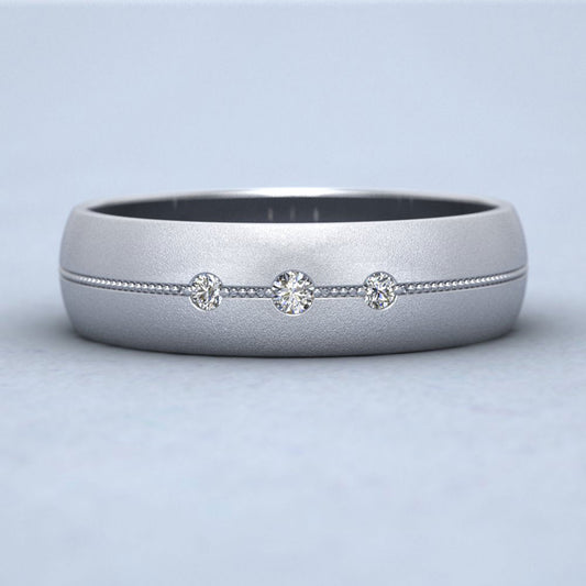 Three Diamond And Centre Millgrain Pattern 14ct White Gold 6mm Wedding Ring