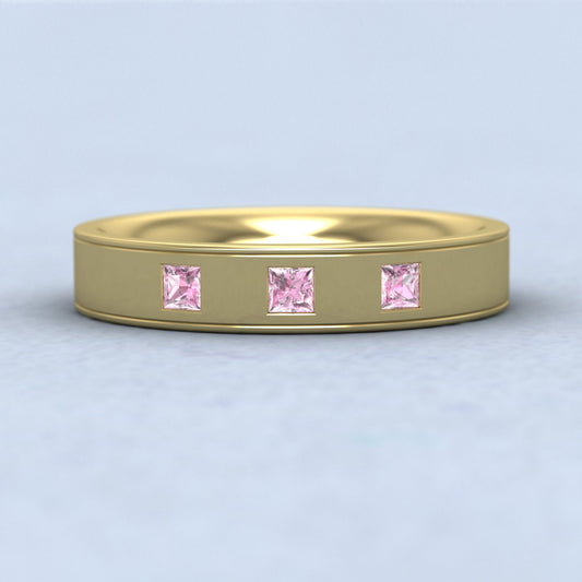 Princess Cut Pink Sapphire And Line Patterned 14ct Yellow Gold 4mm Wedding Ring