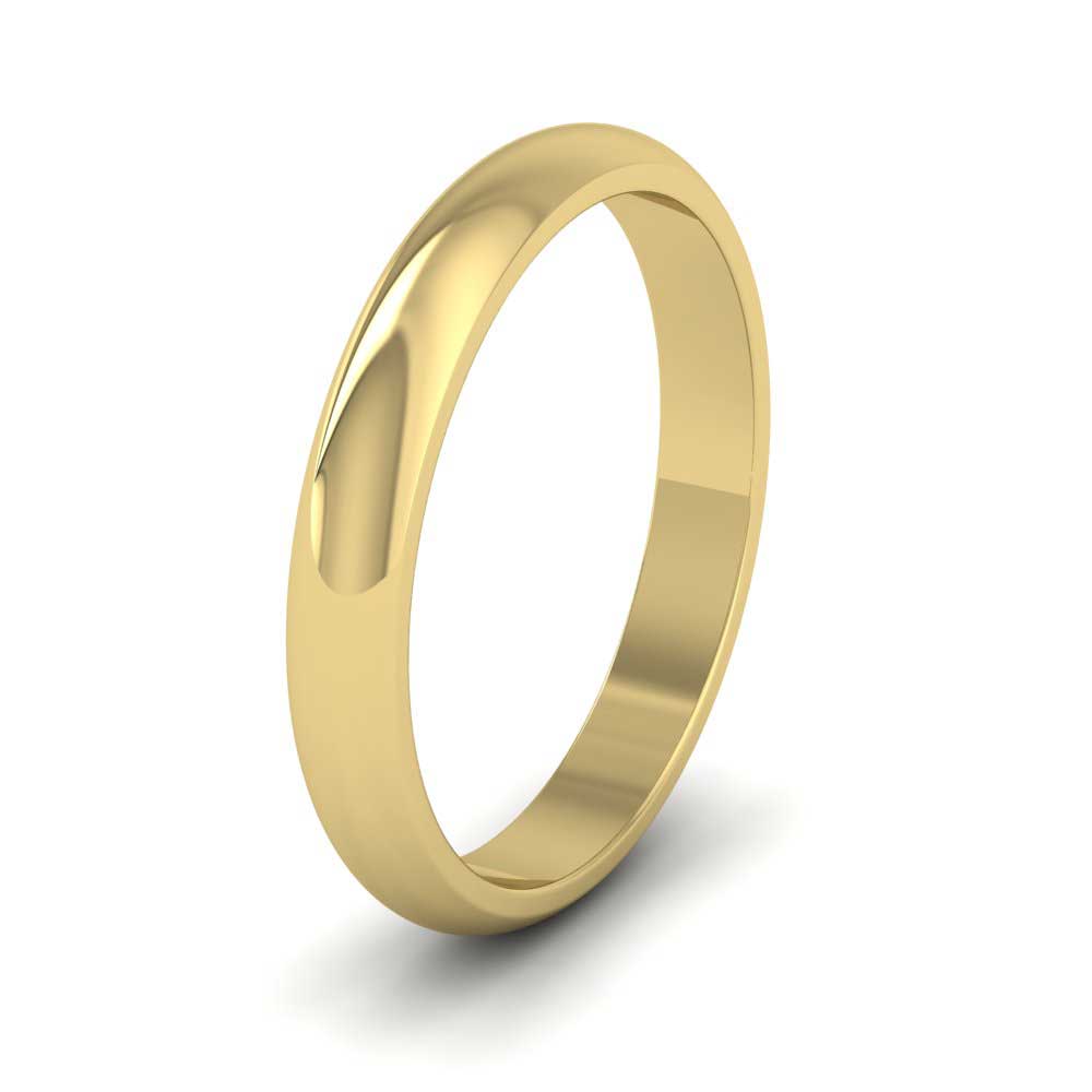 3mm wide extra heavy weight 14ct yellow gold wedding ring. This wedding band has a rounded outside profile with a flat inside and is available in sizes D-Z+6.
