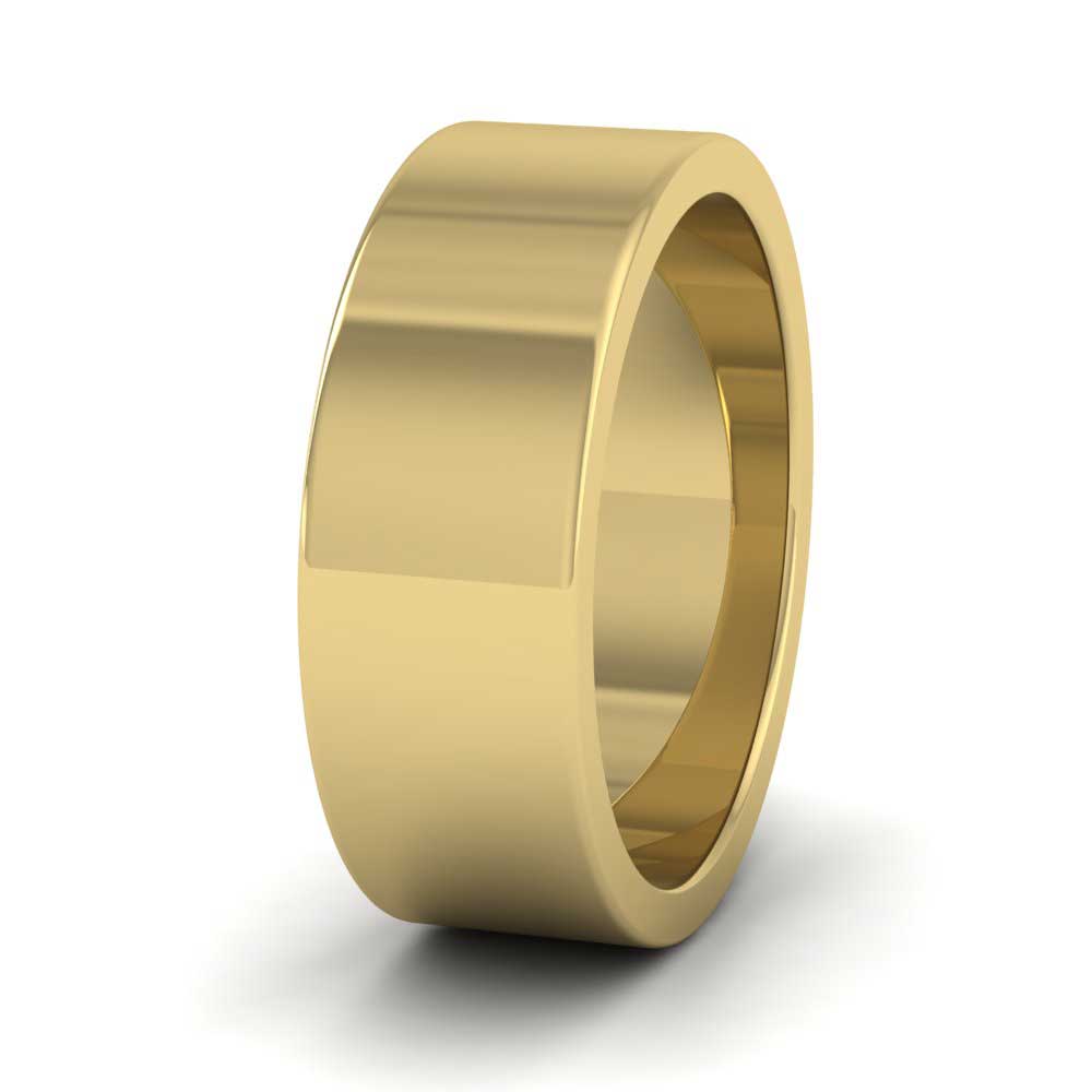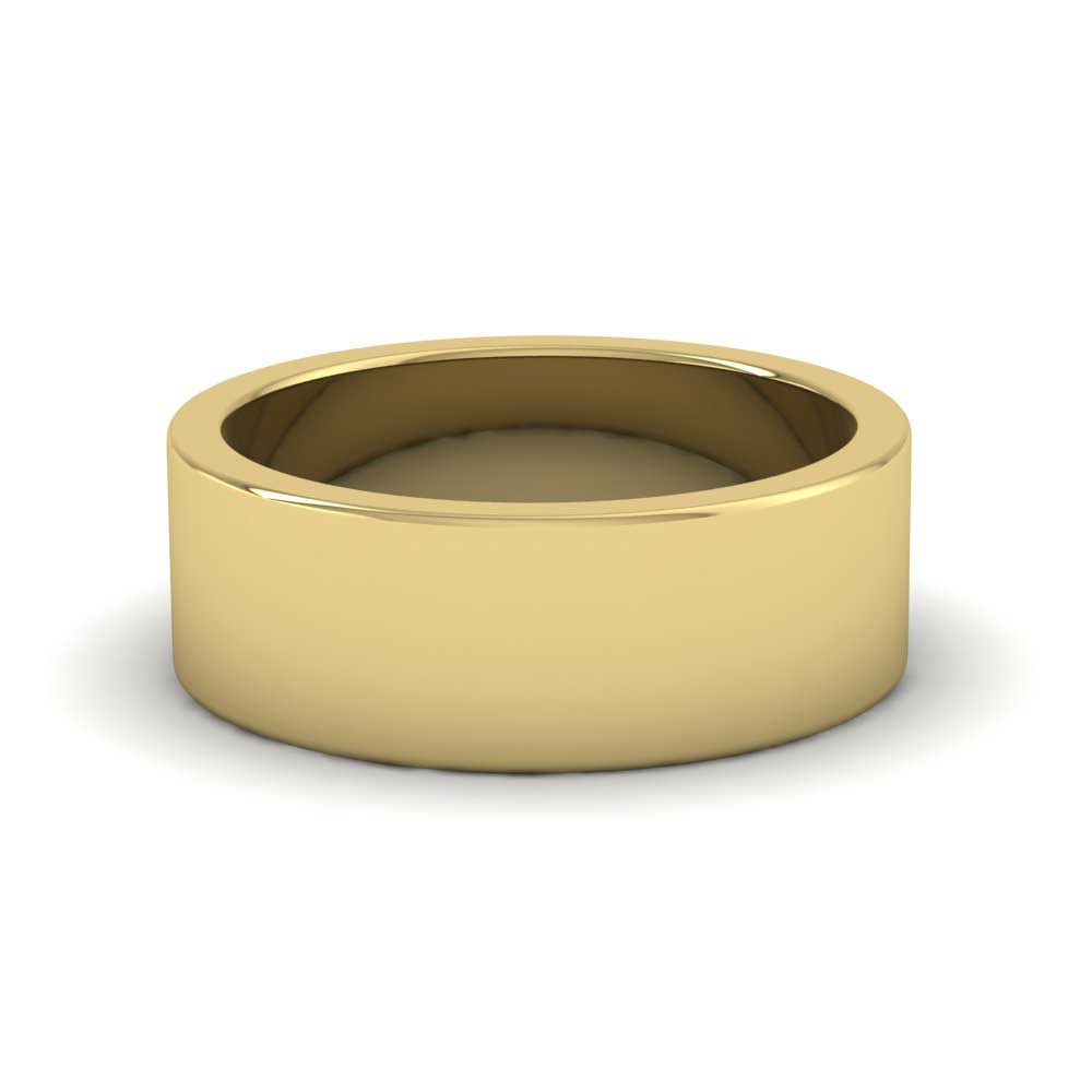 7mm wide super heavy weight 14ct yellow gold wedding ring. This wedding band has a flat outside profile with a flat inside and is available in sizes D-Z+12.
