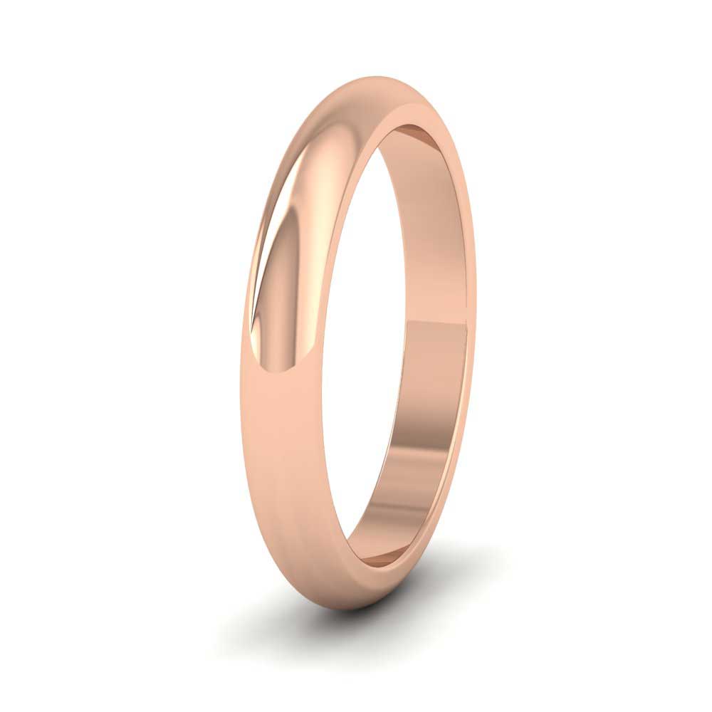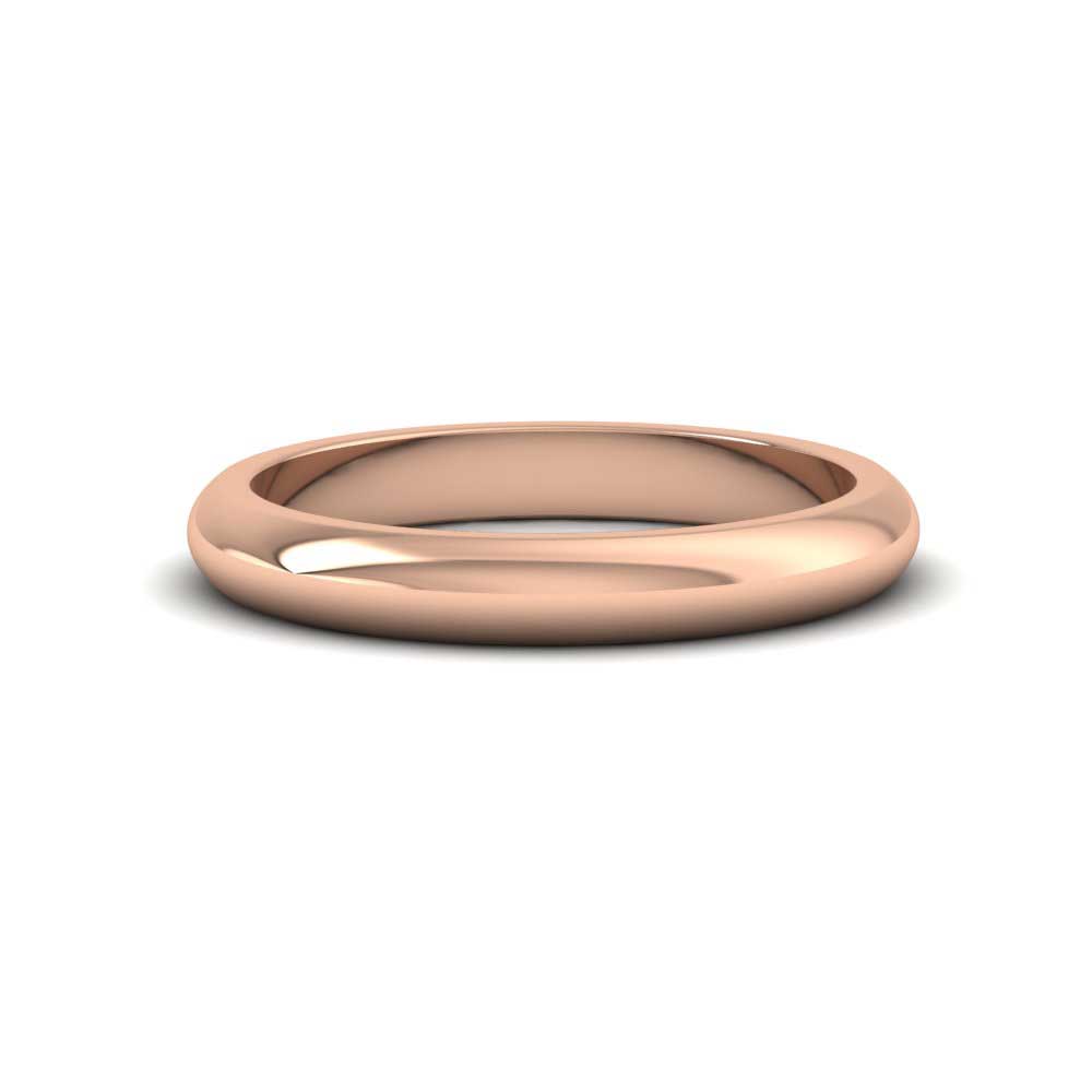 3mm wide super heavy weight 18ct rose gold wedding ring. This wedding band has a rounded outside profile with a flat inside and is available in sizes D-Z+12.