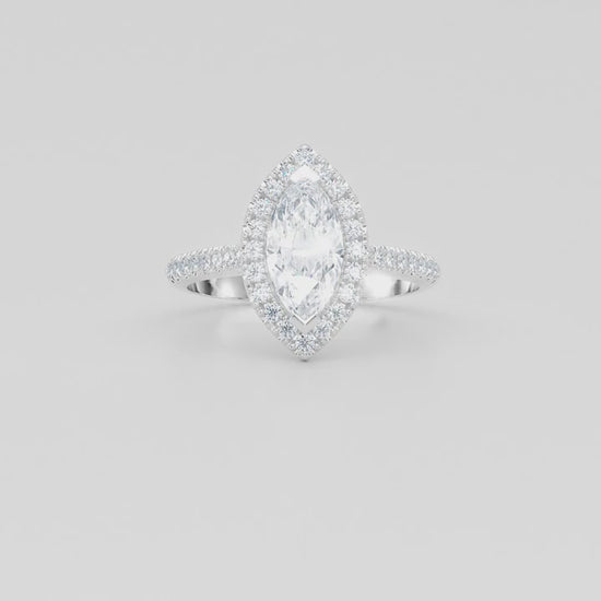 18ct rose gold central marquise diamond (0.5ct SI G/H) halo style ring. Enhanced with diamond set rising shoulders. Total carat weight approximately 0.79ct. 2.5mm D shape band. Video is for design/style purposes only.
