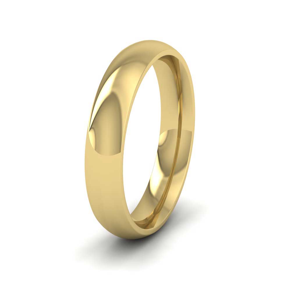 4mm wide extra heavy weight 18ct yellow gold wedding ring. This wedding band has a rounded outside profile with a rounded court shape inside for a softer and more comfortable feeling when worn. Available in sizes D-Z+6.