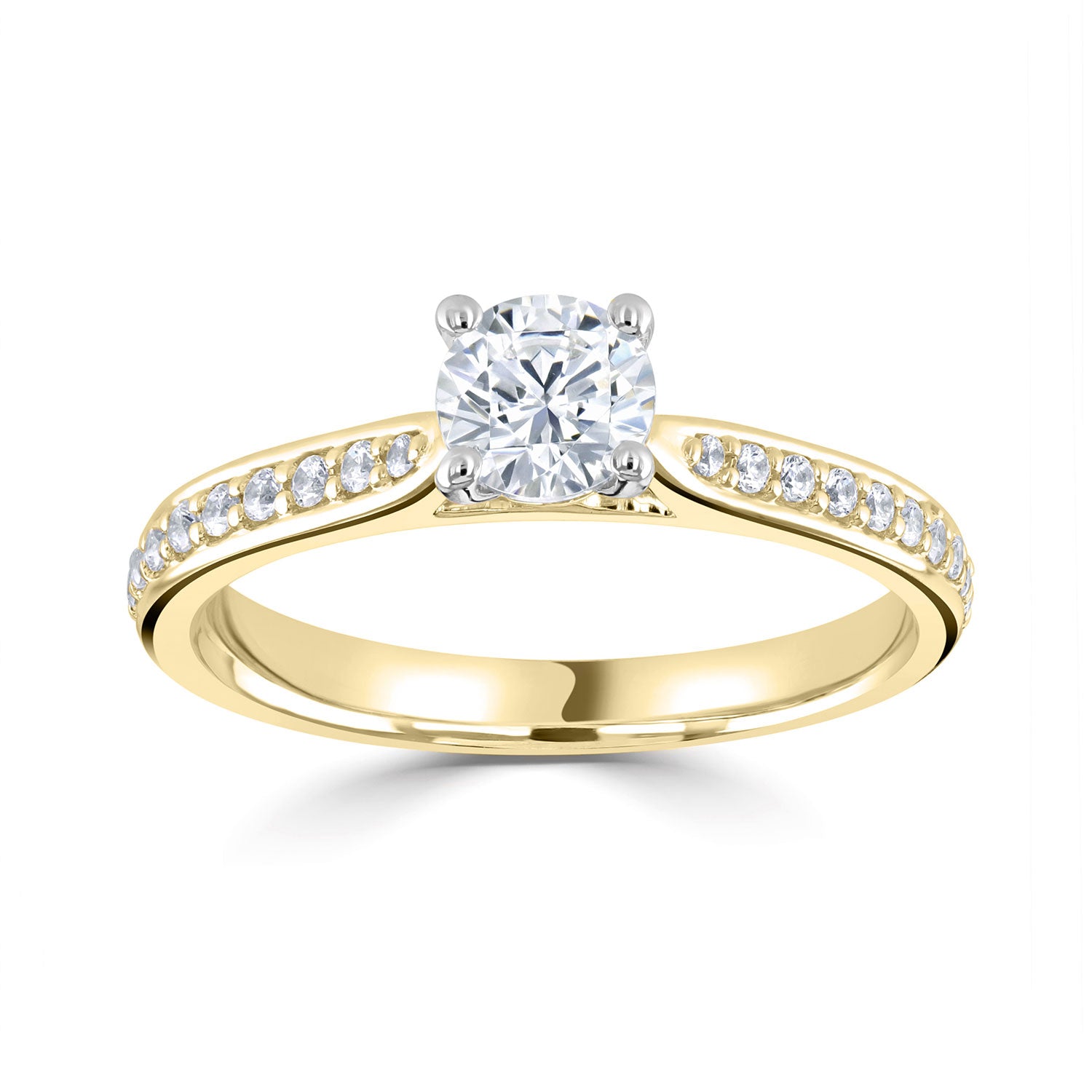 18ct yellow gold and platinum diamond (0.5ct SI G/H ring. Enhanced with pave set rising shoulder. Soft cushion court profile, 2.5mm wide. Total carat weight approximately 0.65ct. Video is for design/style purposes only.