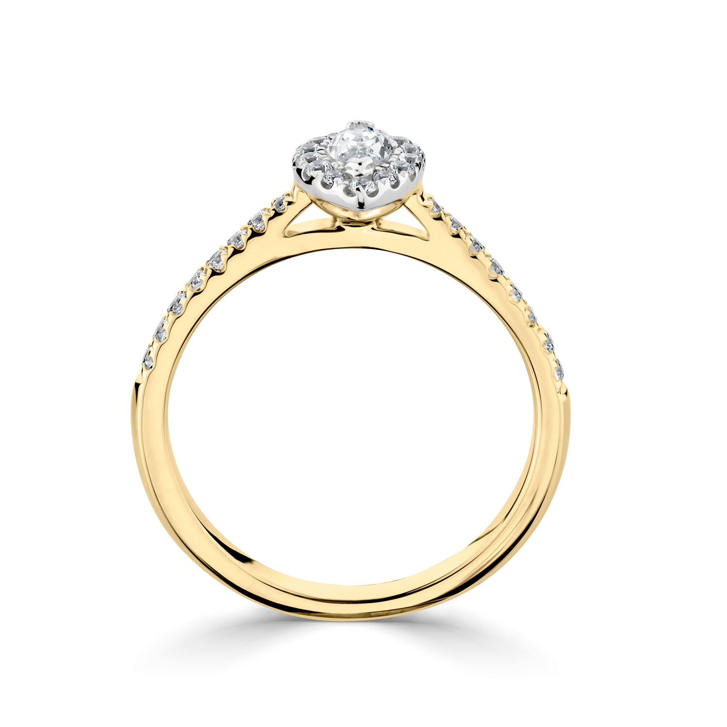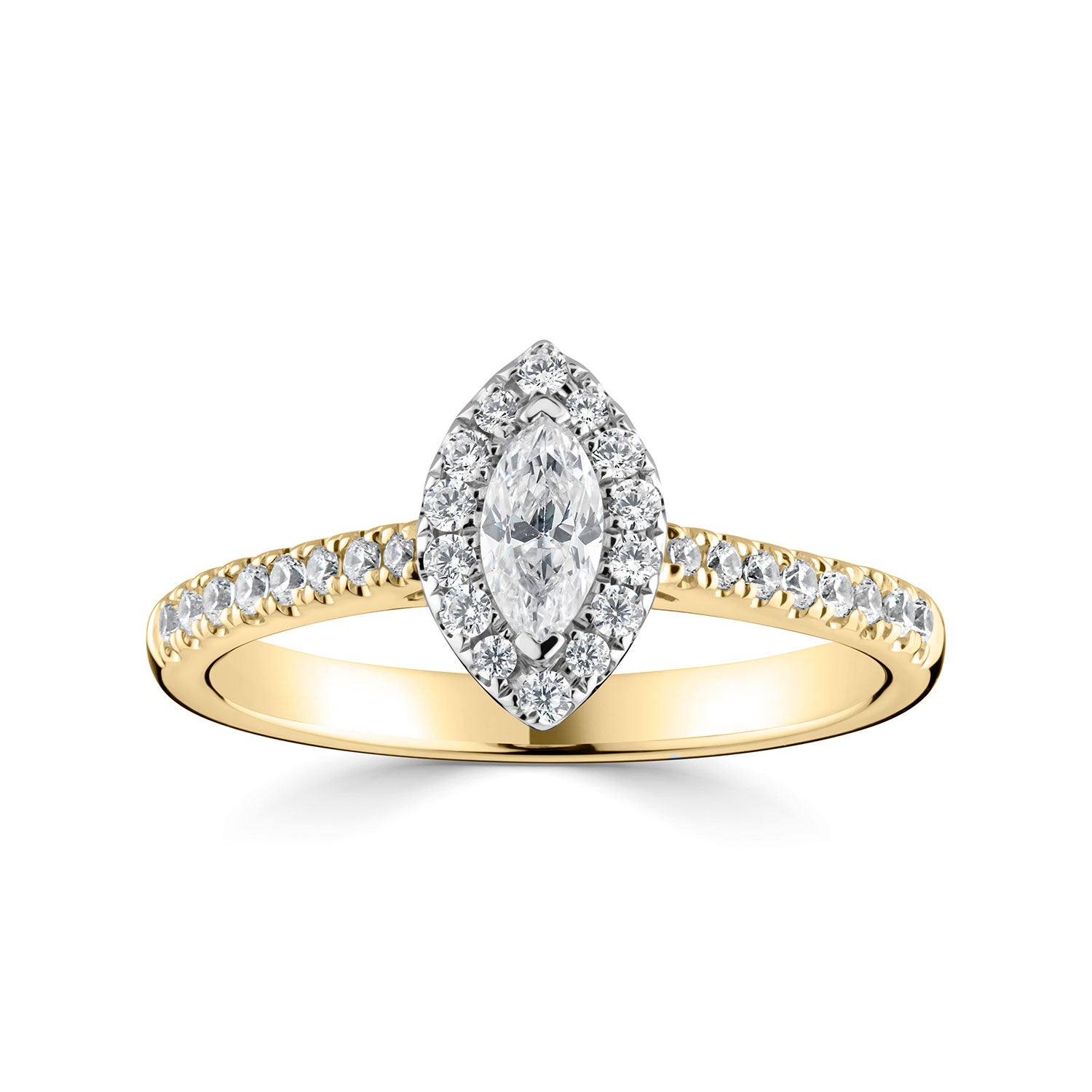 18ct yellow gold and platinum central marquise diamond (0.5ct SI G/H) halo style ring. Enhanced with diamond set rising shoulders. Total carat weight approximately 0.79ct. 2.5mm D shape band. Video is for design/style purposes only.