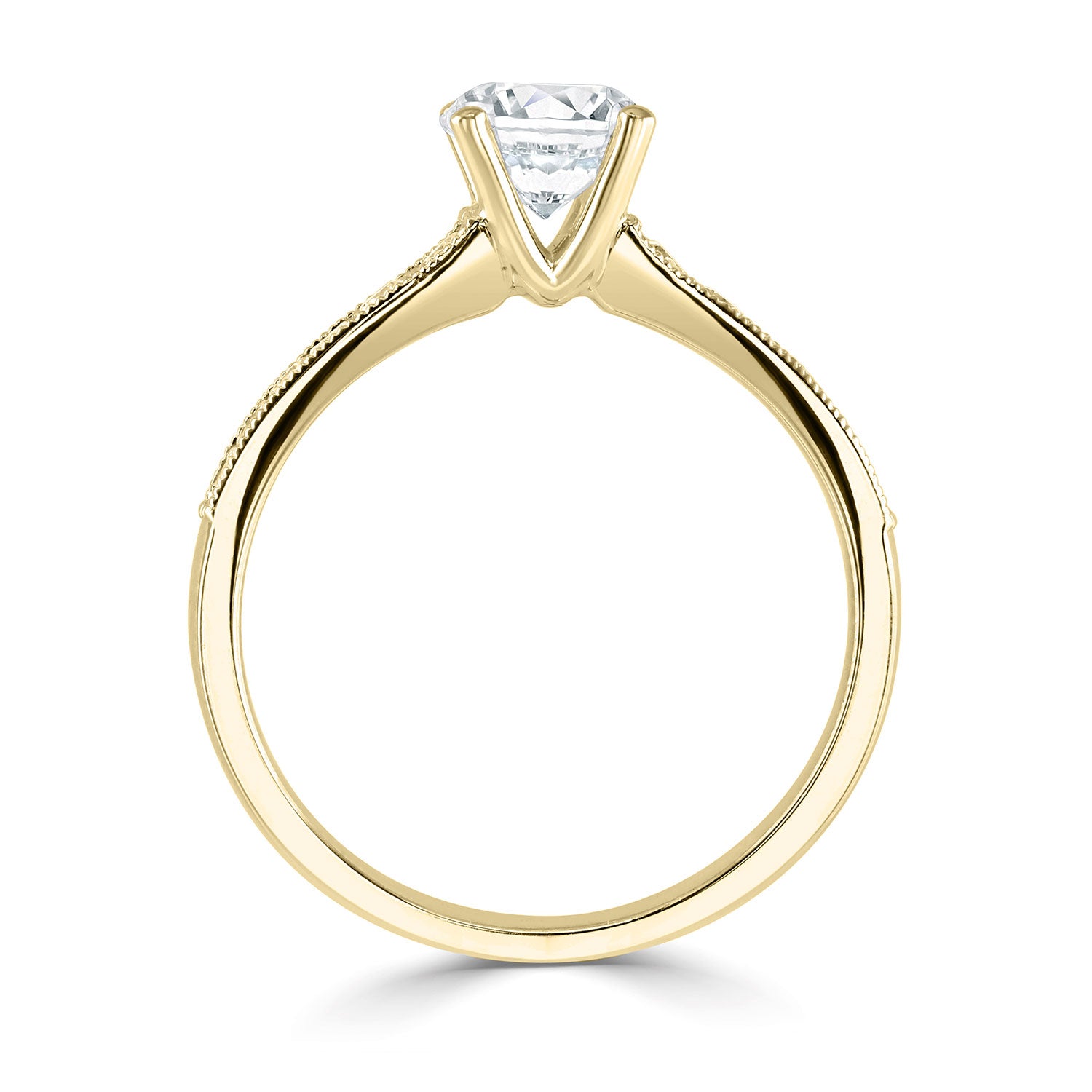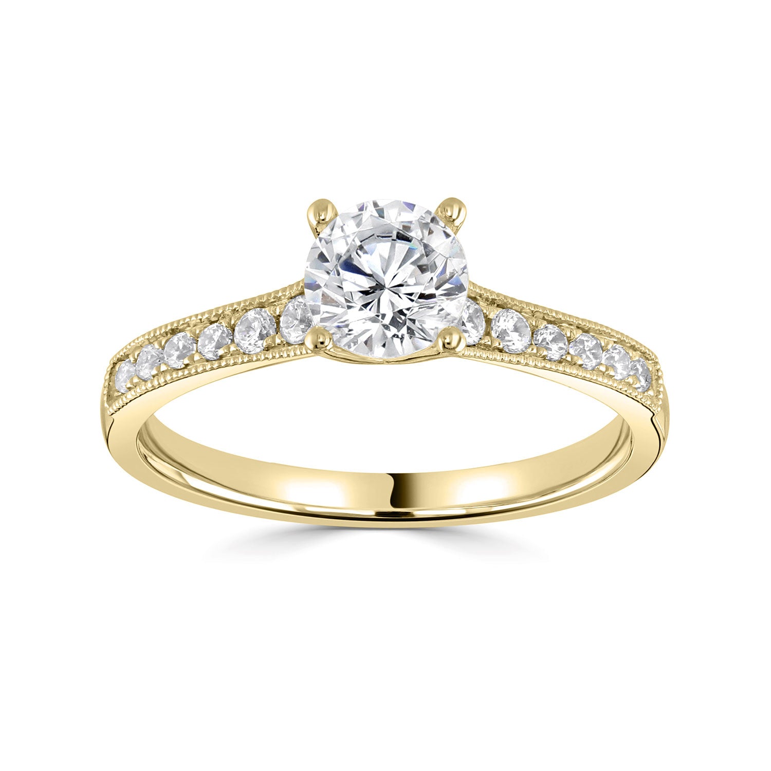 18ct Yellow Gold Four Claw Diamond Ring With Milgrain And Diamond Shoulders