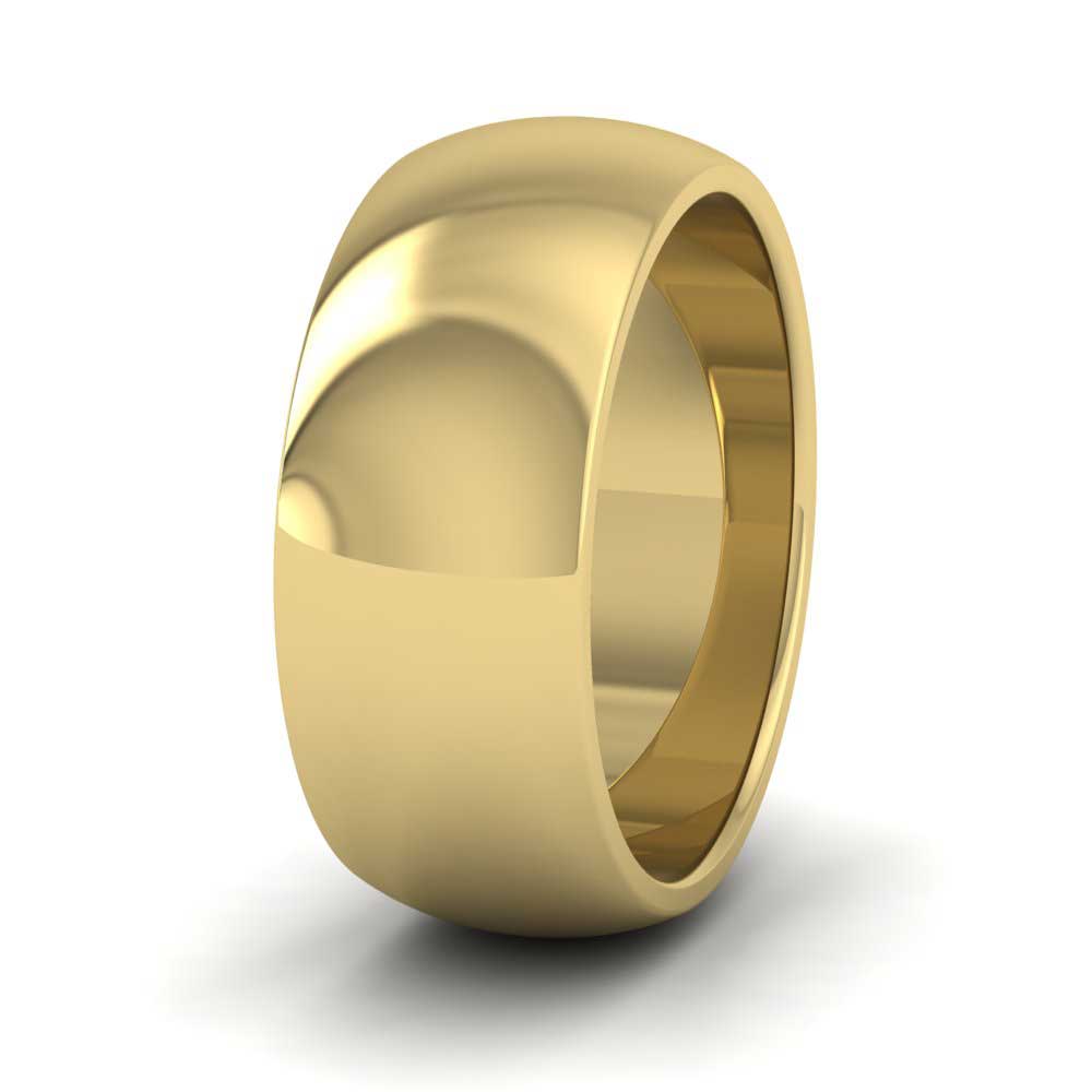 8mm wide super heavy weight 22ct yellow gold wedding ring. This wedding band has a rounded outside profile with a flat inside and is available in sizes D-Z+12.