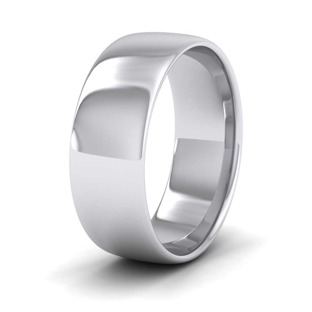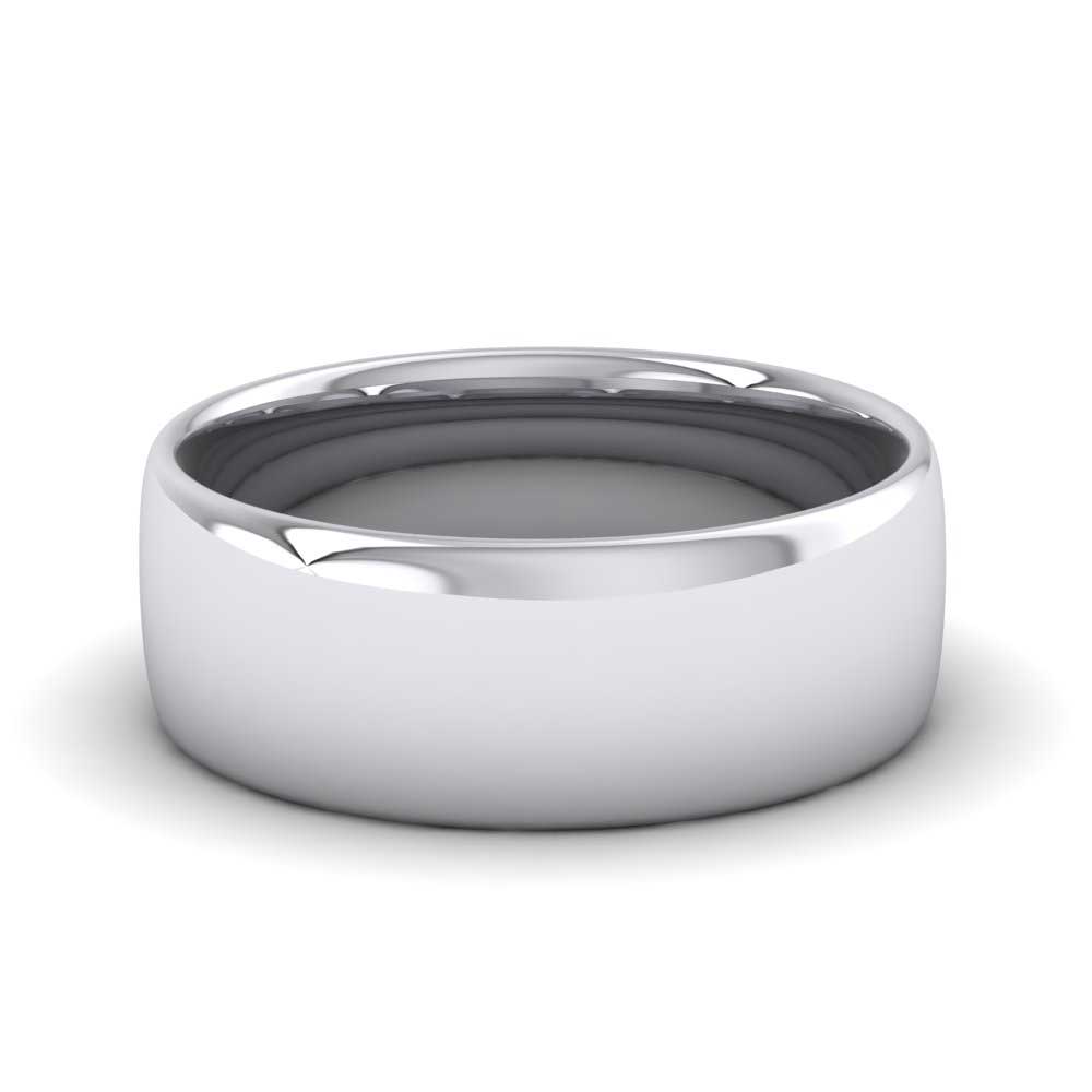7mm wide classic weight 950 palladium wedding ring. This wedding band has a shallow curved outside profile softened rounded edges with a rounded shape inside for a softer and more comfortable feeling when worn. Sizes D - Z+3.