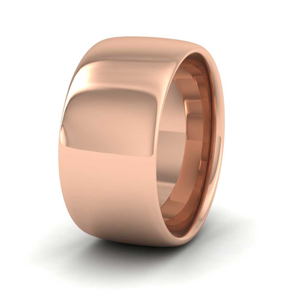 Wide 10mm extra heavy weight 9ct rose gold wedding ring. This wedding band has a shallow curved outside profile softened rounded edges with a rounded shape inside for a softer and more comfortable feeling when worn. Sizes D-Z+6.