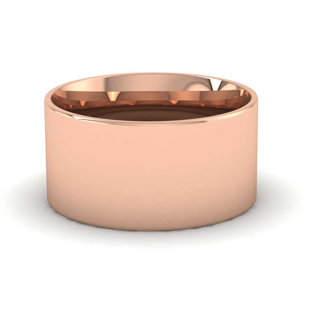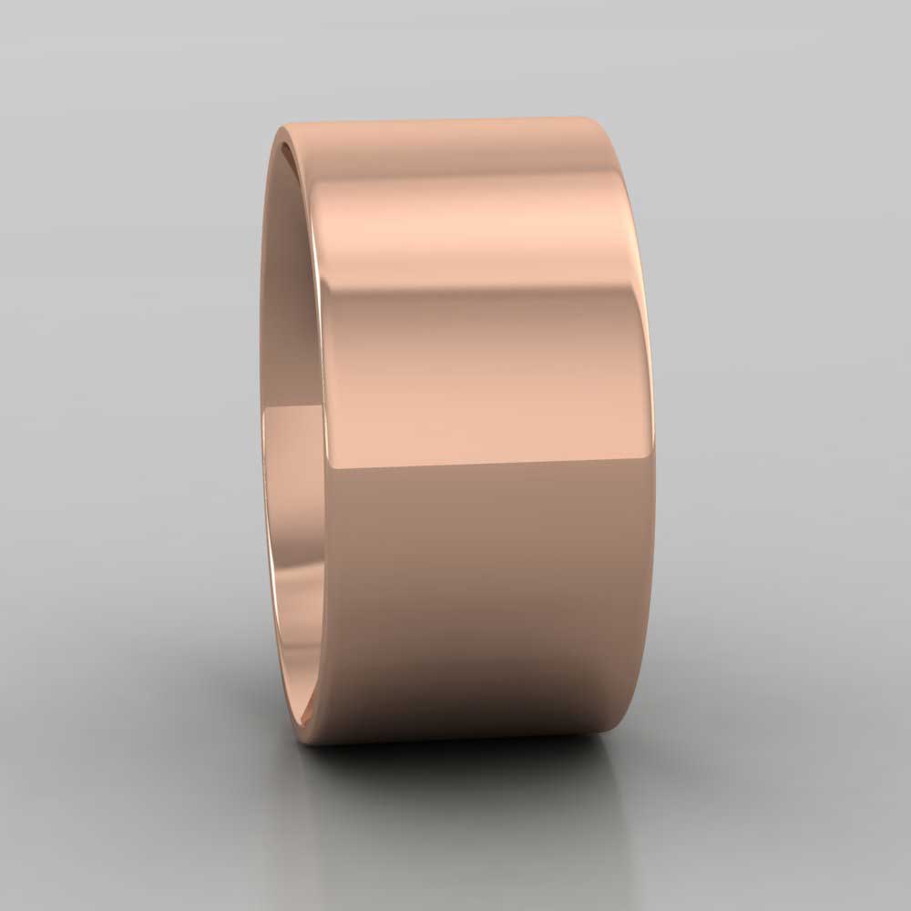 Wide 10mm classic weight 9ct rose gold wedding ring. This wedding band has a flat outside profile with a rounded court shape inside for a softer and more comfortable feeling when worn. Available in sizes D-Z+3.