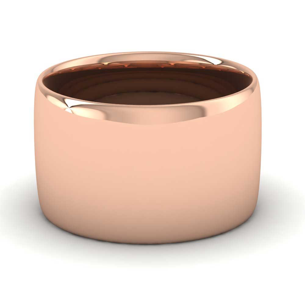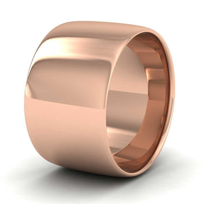 Wide 12mm classic weight 9ct rose gold wedding ring. This wedding band has a shallow curved outside profile softened rounded edges with a rounded shape inside for a softer and more comfortable feeling when worn. Sizes D-Z+3.