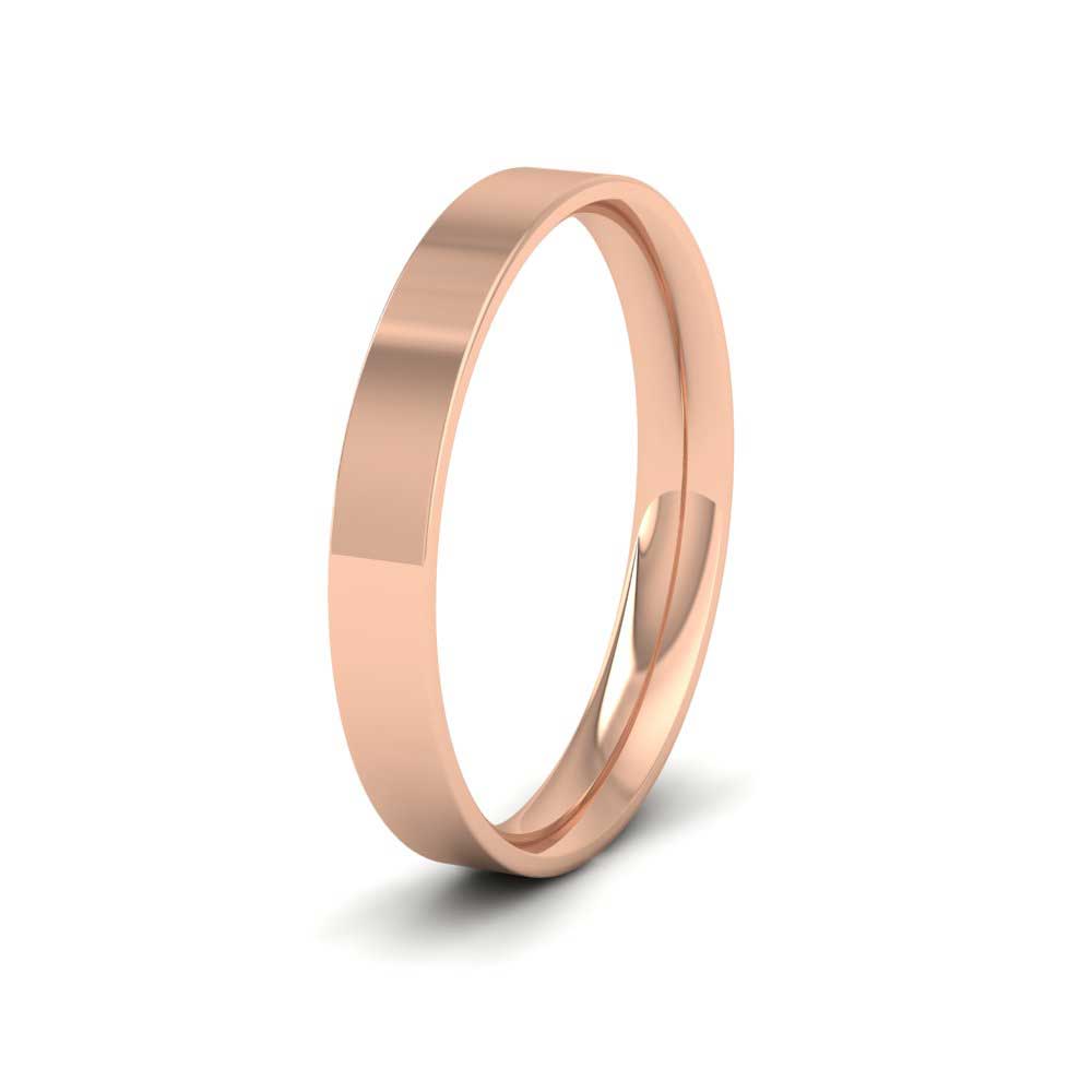 3mm wide classic weight 9ct rose gold wedding ring. This wedding band has a flat outside profile with a rounded court shape inside for a softer and more comfortable feeling when worn. Available in sizes D-Z+3.