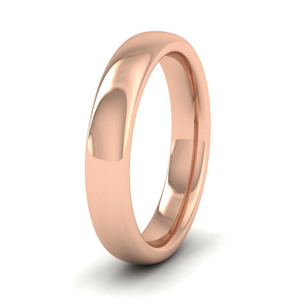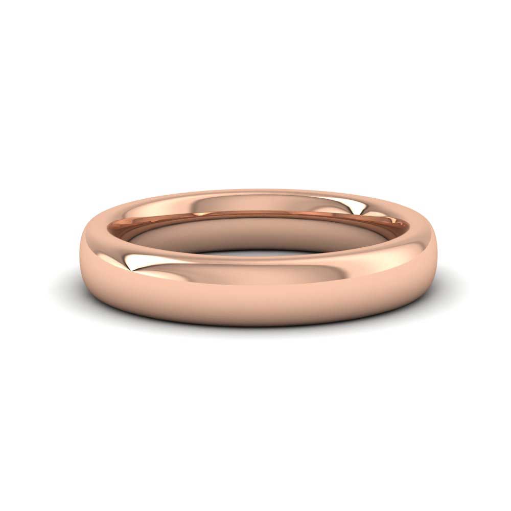 4mm wide super heavy weight 9ct rose gold wedding ring. This wedding band has a shallow curved outside profile softened rounded edges with a rounded shape inside for a softer and more comfortable feeling when worn. Sizes D-Z+12.
