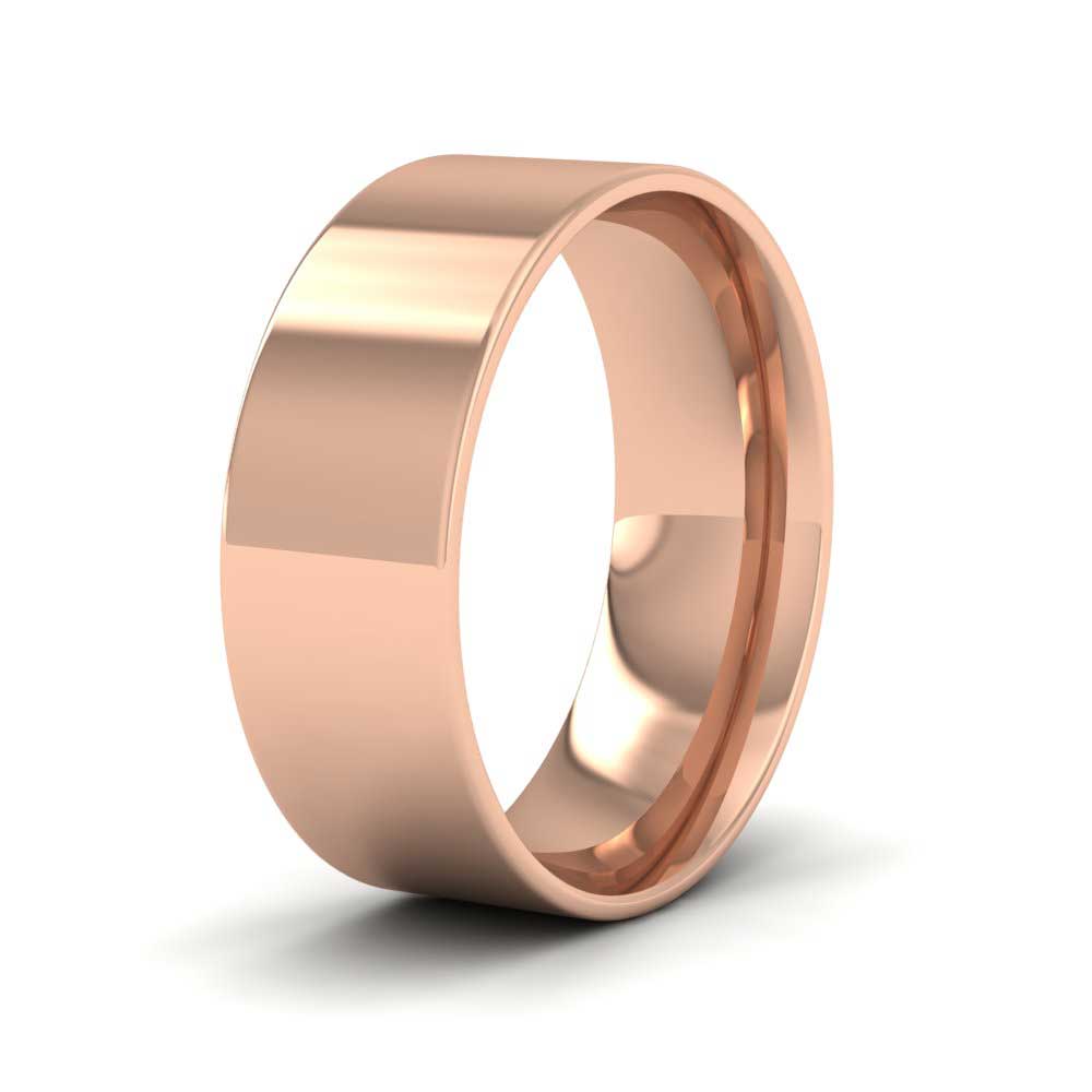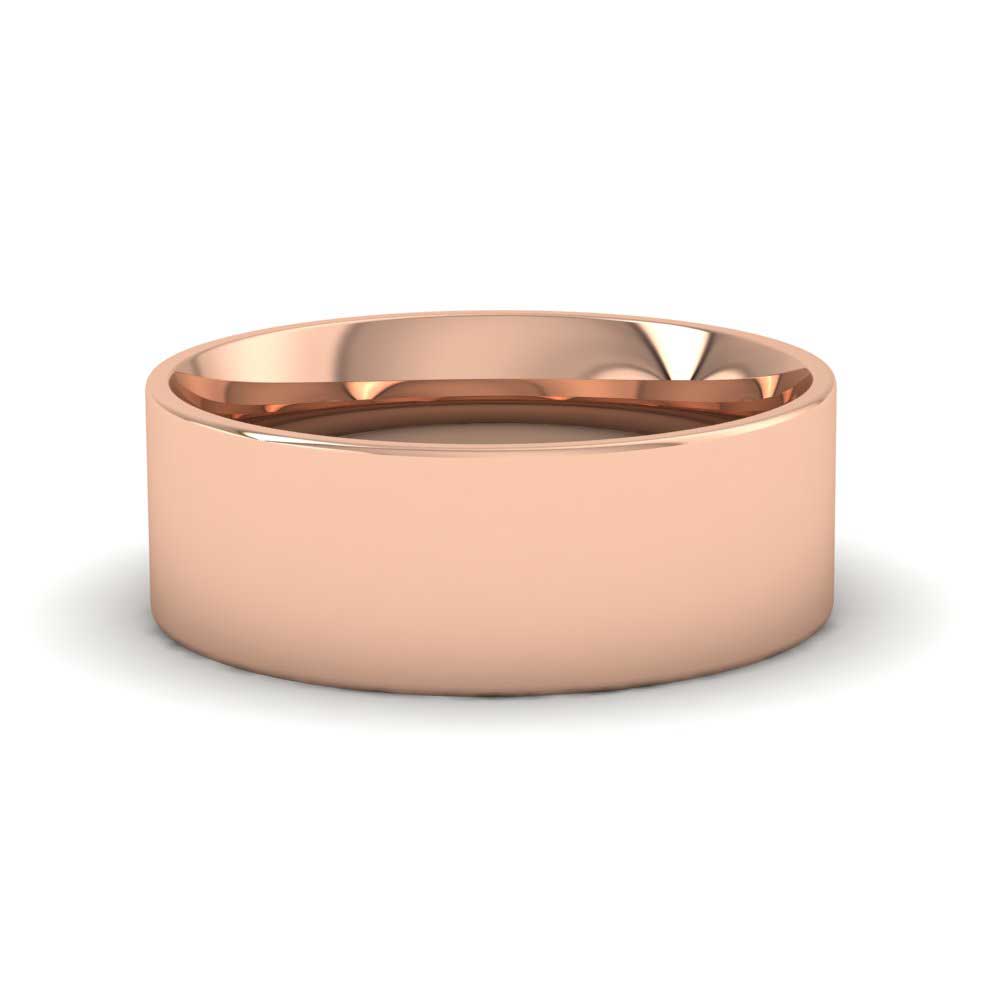 7mm wide classic weight 9ct rose gold wedding ring. This wedding band has a flat outside profile with a rounded court shape inside for a softer and more comfortable feeling when worn. Available in sizes D-Z+3.
