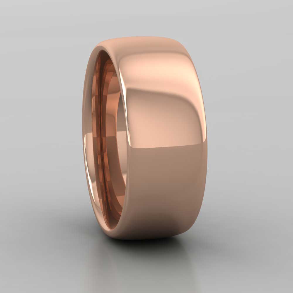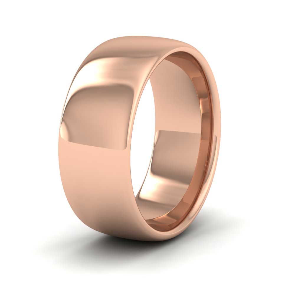 8mm wide extra heavy weight 9ct rose gold wedding ring. This wedding band has a shallow curved outside profile softened rounded edges with a rounded shape inside for a softer and more comfortable feeling when worn. Sizes D-Z+6.