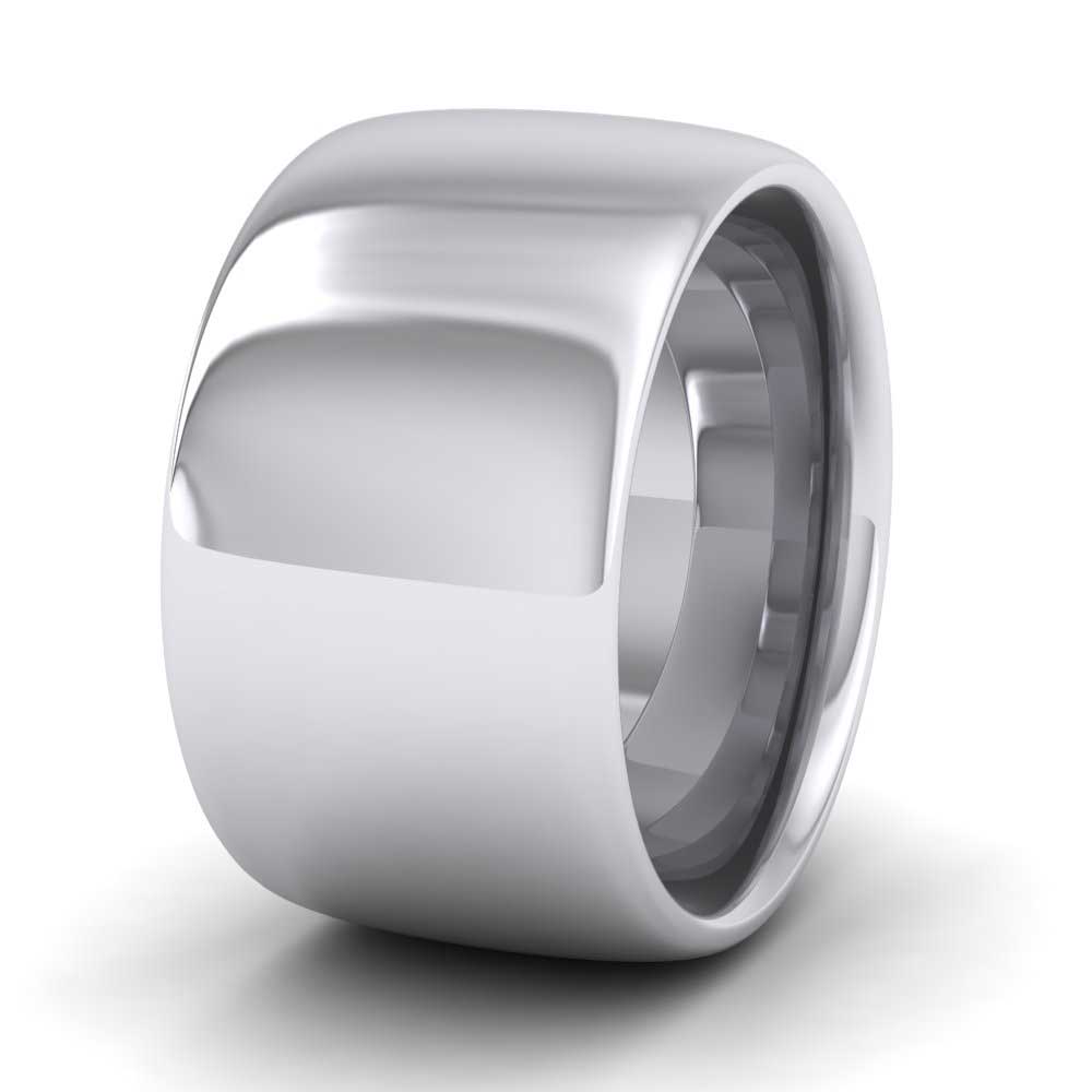 Wide 12mm super heavy weight 9ct white gold wedding ring. This wedding band has a shallow curved outside profile softened rounded edges with a rounded shape inside for a softer and more comfortable feeling when worn. Sizes D-Z+12.