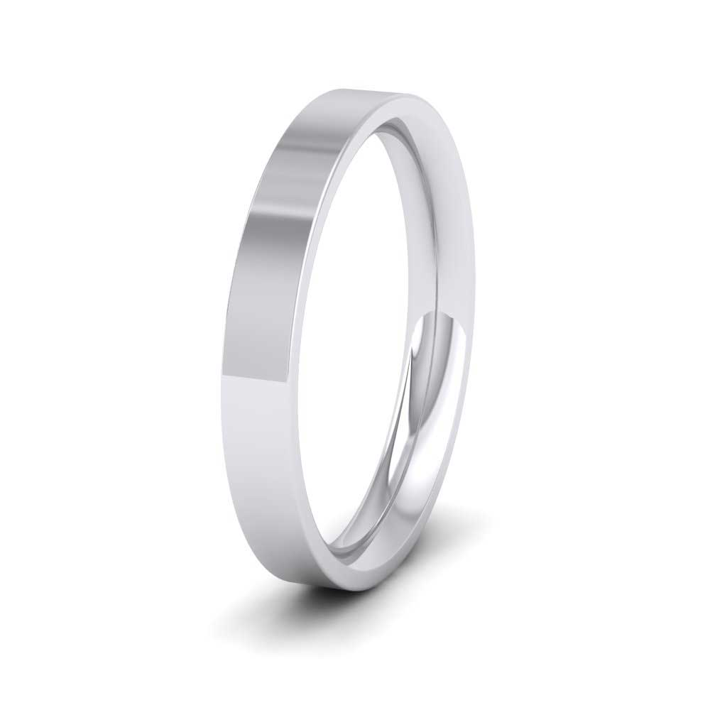 3mm wide extra heavy weight 9ct white gold wedding ring. This wedding band has a flat outside profile with a rounded court shape inside for a softer and more comfortable feeling when worn. Available in sizes D-Z+6.