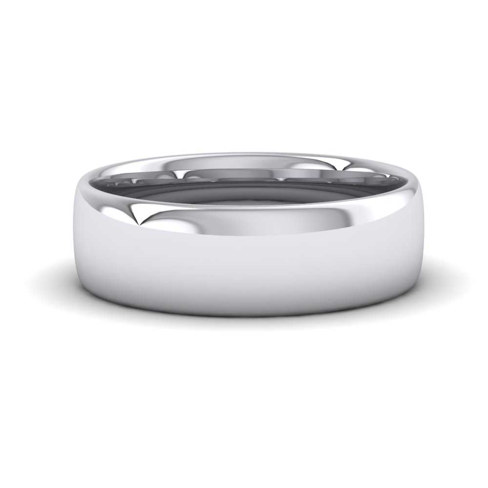 6mm wide classic weight 9ct white gold wedding ring. This wedding band has a shallow curved outside profile softened rounded edges with a rounded shape inside for a softer and more comfortable feeling when worn. Sizes D-Z+3.