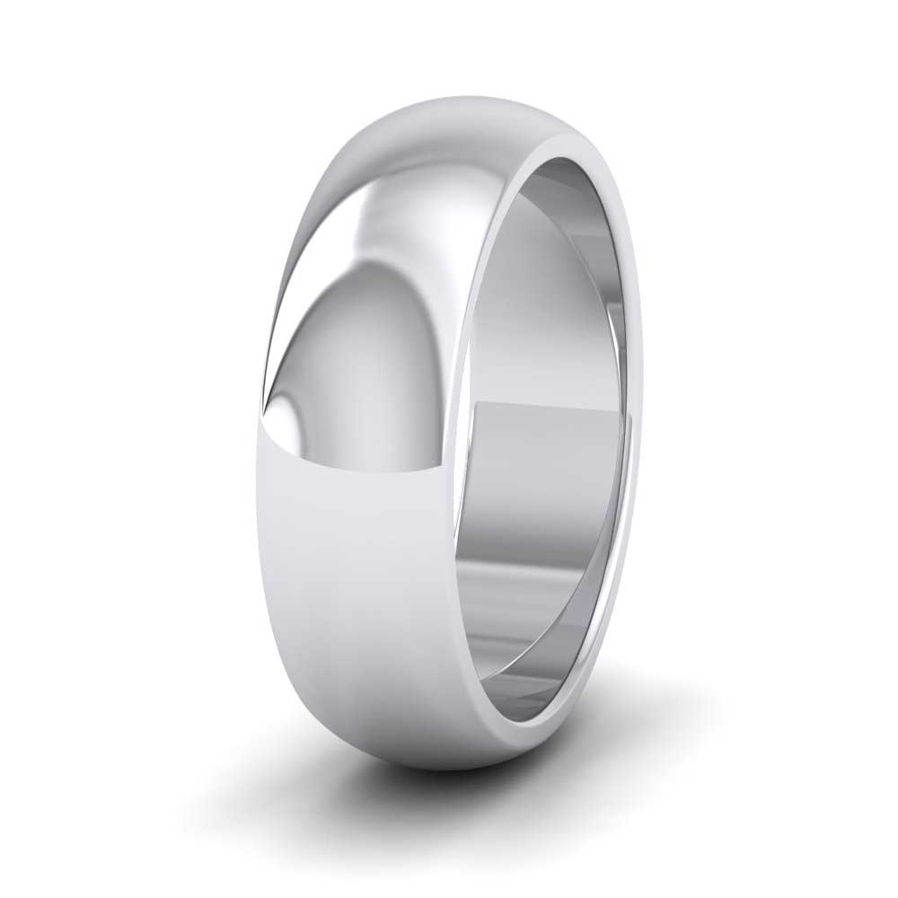 6mm wide super heavy weight 9ct white gold wedding ring. This wedding band has a rounded outside profile with a flat inside and is available in sizes D-Z+12.