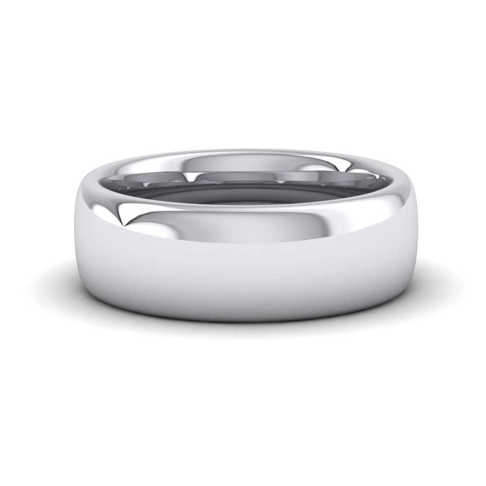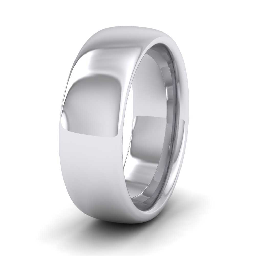 7mm wide super heavy weight 9ct white gold wedding ring. This wedding band has a shallow curved outside profile softened rounded edges with a rounded shape inside for a softer and more comfortable feeling when worn. Sizes D-Z+12.