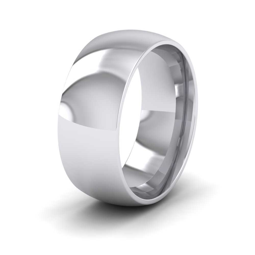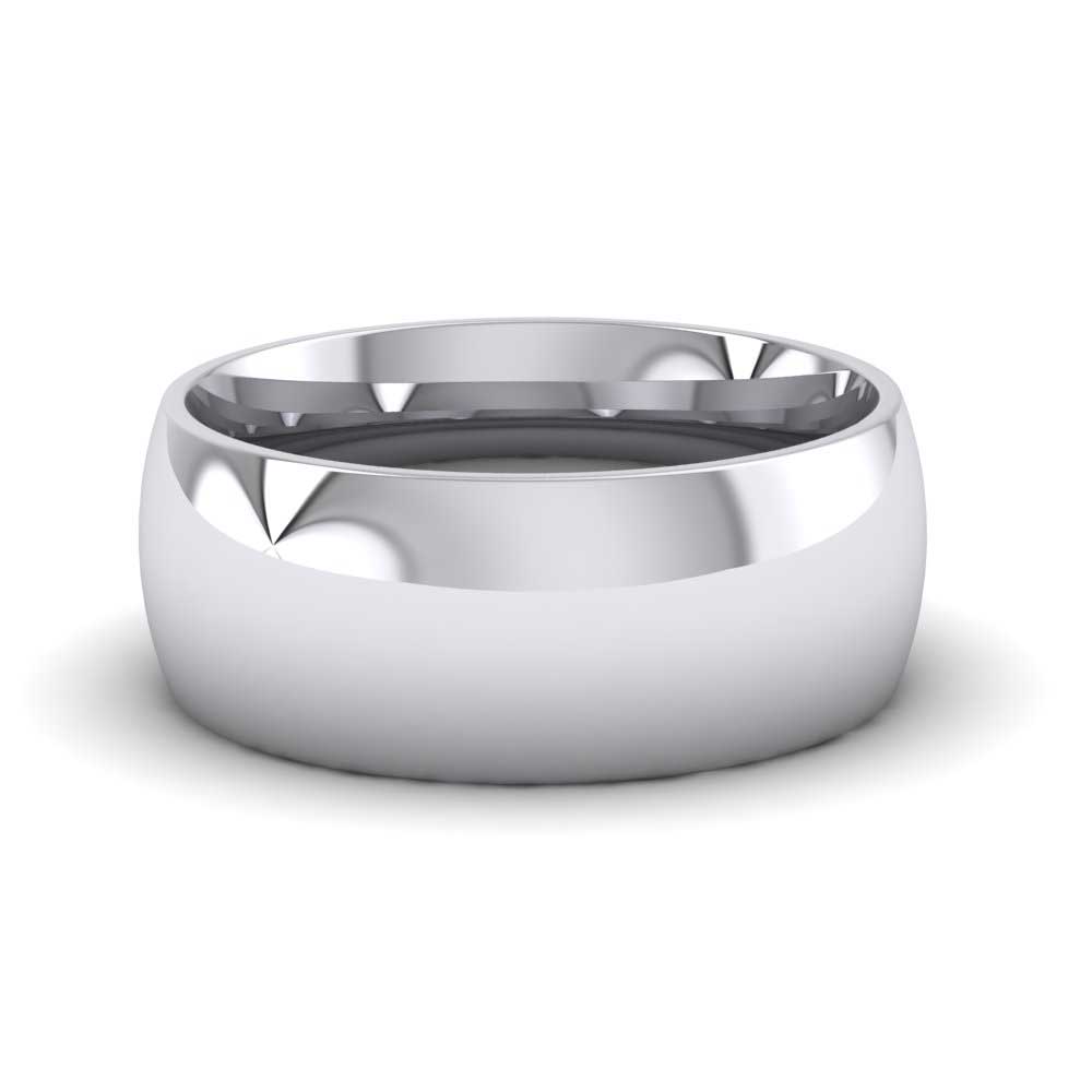 8mm wide extra heavy weight 9ct white gold wedding ring. This wedding band has a rounded outside profile with a rounded court shape inside for a softer and more comfortable feeling when worn. Available in sizes D-Z+6.