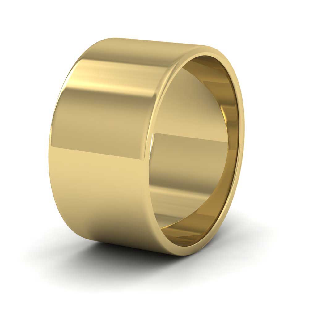 Wide 10mm classic weight 9ct yellow gold wedding ring. This wedding band has a flat outside profile with a flat inside and is available in sizes D-Z+3.