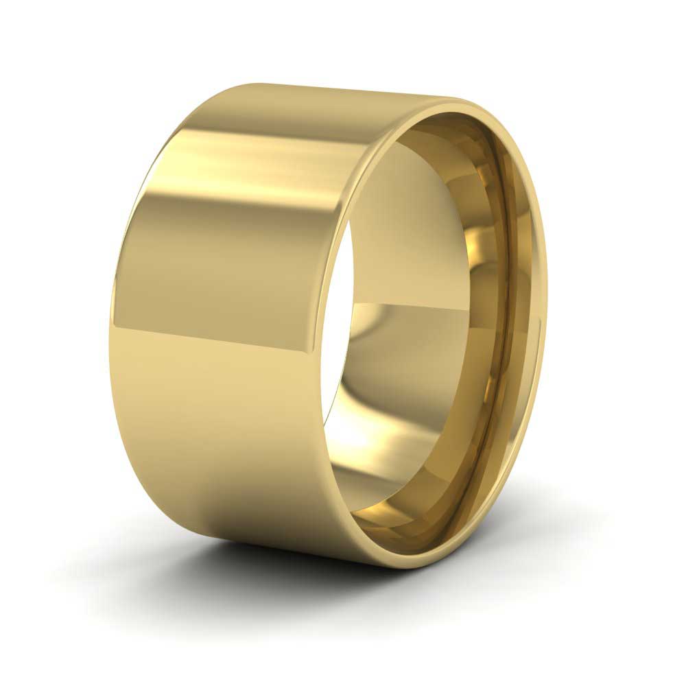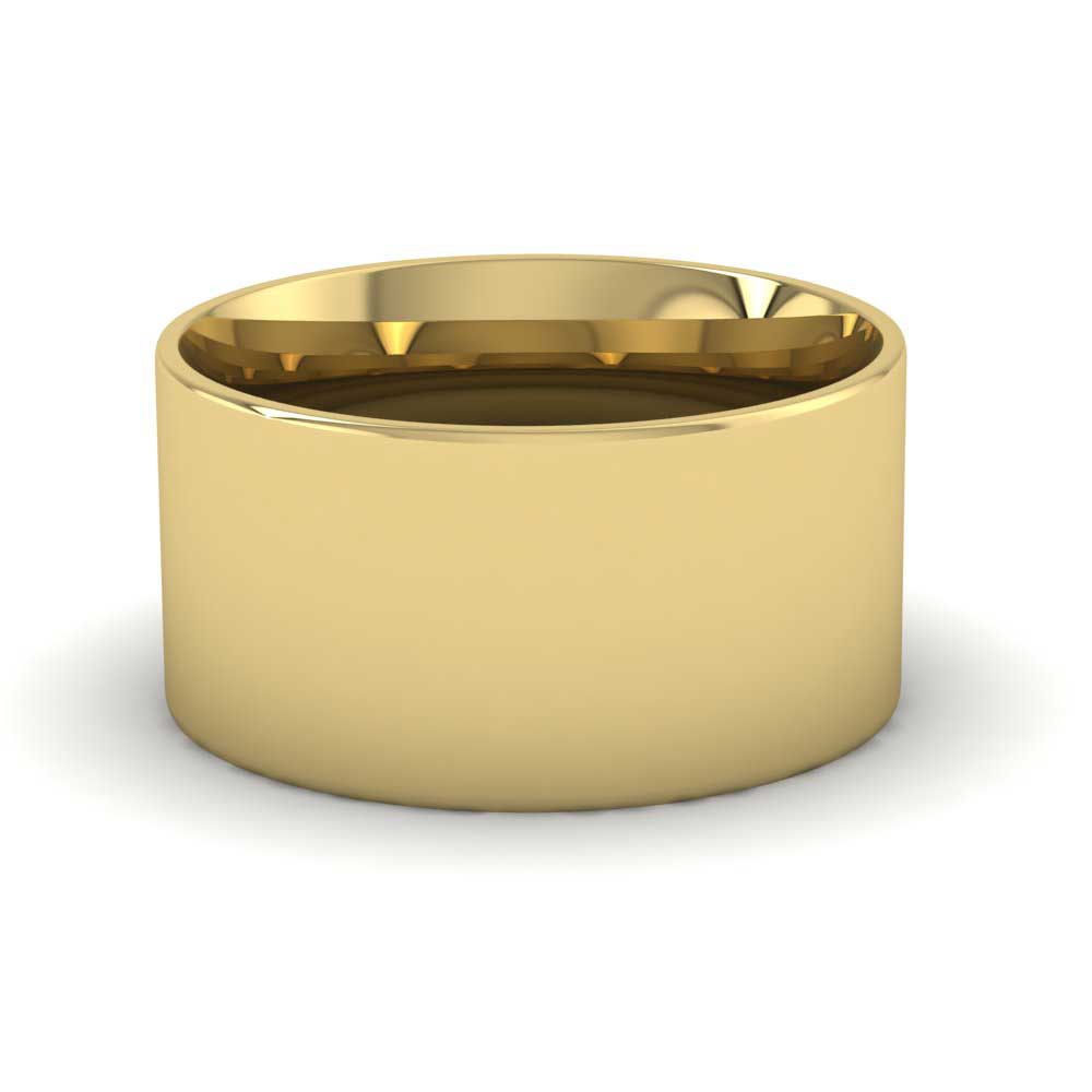 Wide 10mm classic weight 9ct yellow gold wedding ring. This wedding band has a flat outside profile with a rounded court shape inside for a softer and more comfortable feeling when worn. Available in sizes D-Z+3.