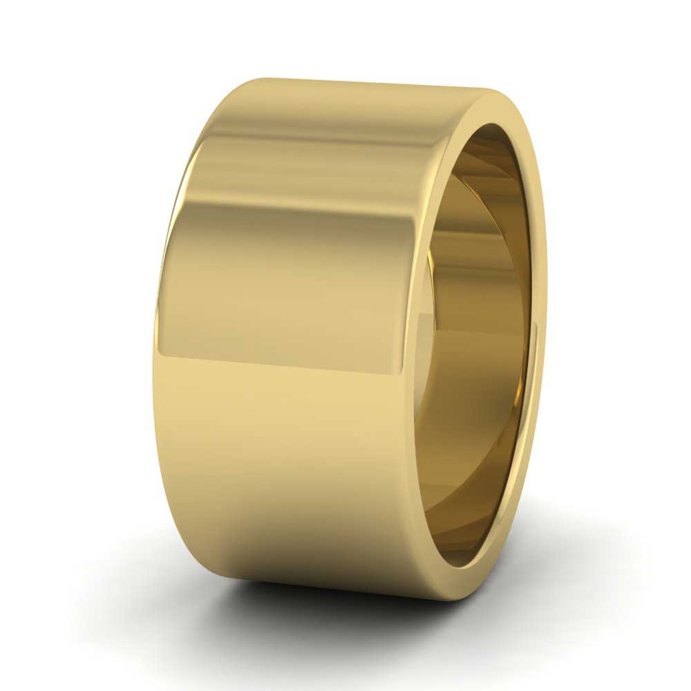 Wide 10mm super heavy weight 9ct yellow gold wedding ring. This wedding band has a flat outside profile with a flat inside and is available in sizes D-Z+12.
