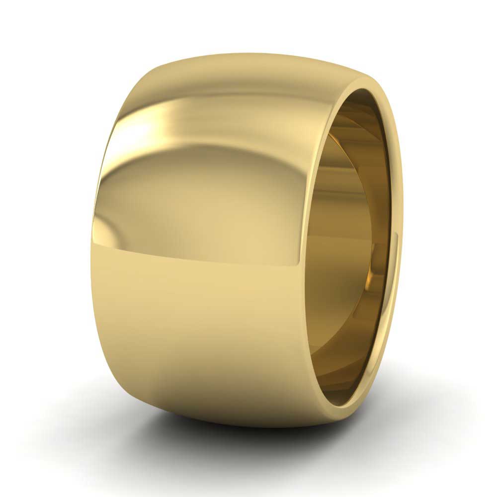 Wide 12mm super heavy weight 9ct yellow gold wedding ring. This wedding band has a rounded outside profile with a flat inside and is available in sizes D-Z+12.