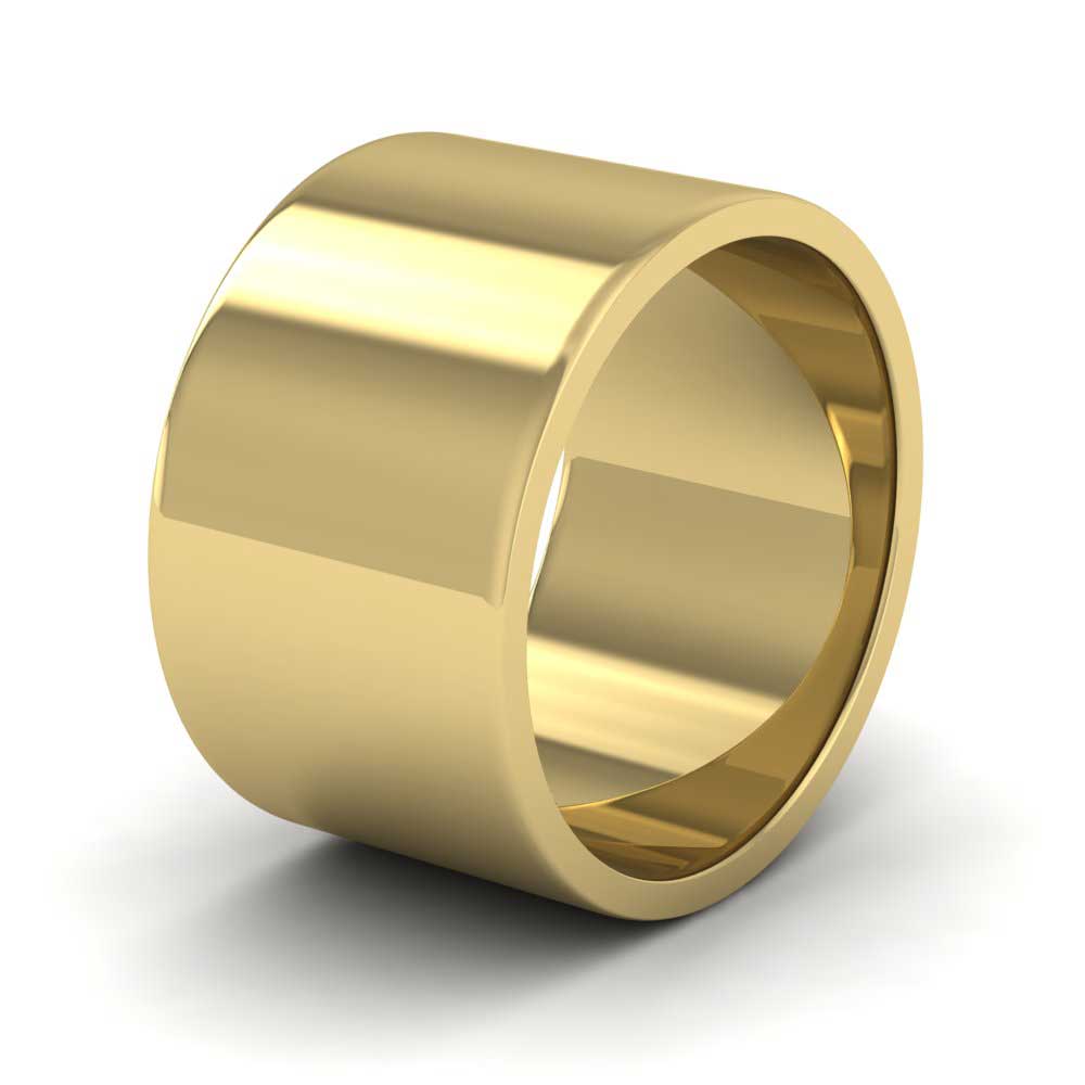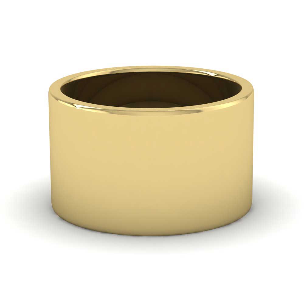 Wide 12mm extra heavy weight 9ct yellow gold wedding ring. This wedding band has a flat outside profile with a flat inside and is available in sizes D-Z+6.