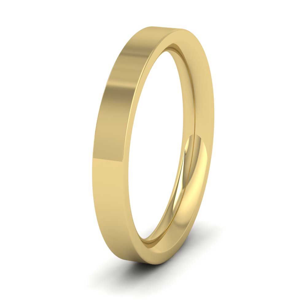 3mm wide super heavy weight 9ct yellow gold wedding ring. This wedding band has a flat outside profile with a rounded court shape inside for a softer and more comfortable feeling when worn. Available in sizes D-Z+12.