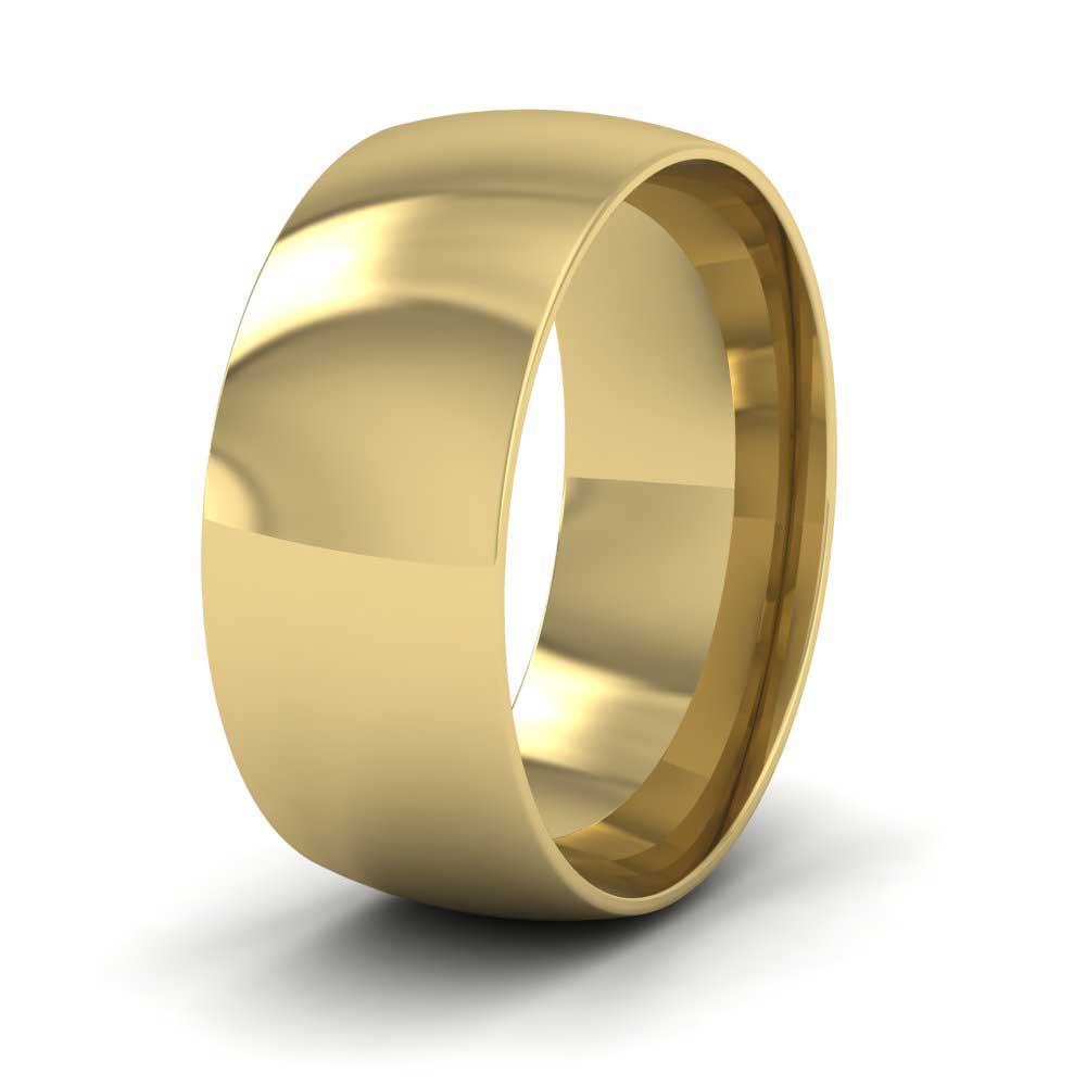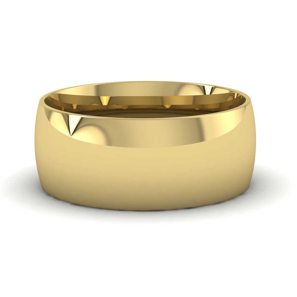 8mm wide classic weight 9ct yellow gold wedding ring. This wedding band has a rounded outside profile with a rounded court shape inside for a softer and more comfortable feeling when worn. Available in sizes D-Z+3.