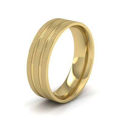 18ct Yellow Gold Double Groove Pattern Flat Wedding Ring. 7mm Wide And Court Shaped For Comfortable Fitting (Shown With A Matt Finish).