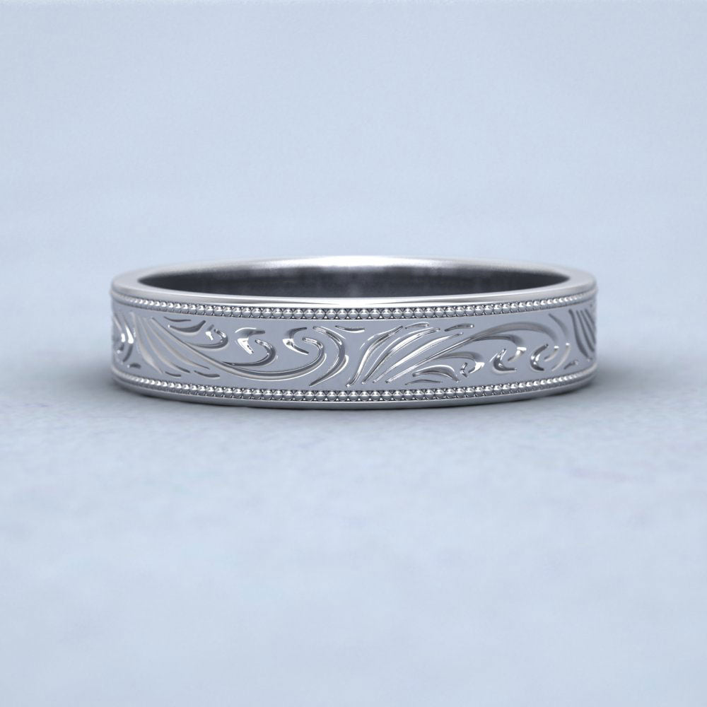 14ct White Gold Engraved Flat Wedding Ring With Millgrain Edge. 4mm Wide