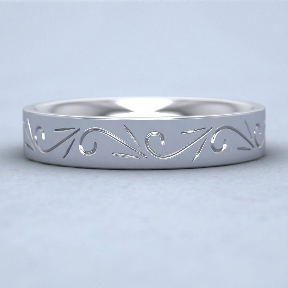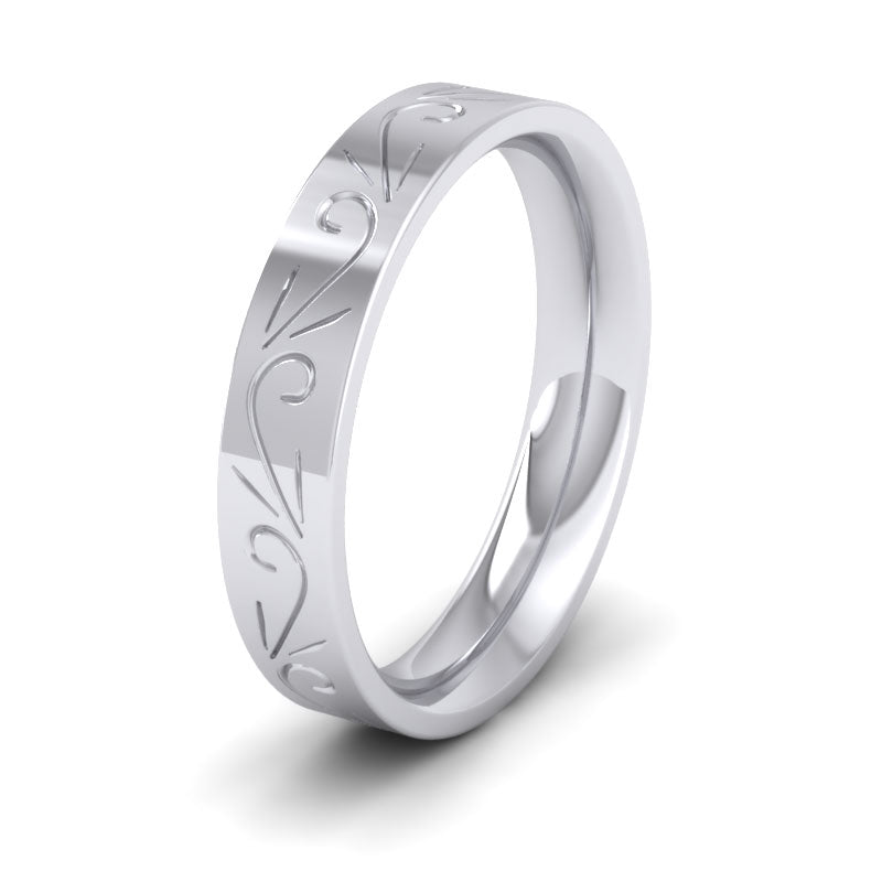 9ct White Gold Engraved Flat Wedding Ring. 4mm Wide And Court Shaped For Comfortable Fitting