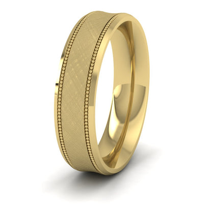 14ct Yellow Gold Hatched Centre And Millgrain Patterned Wedding Ring. 5mm Wide And Court Shaped For Comfortable Fitting