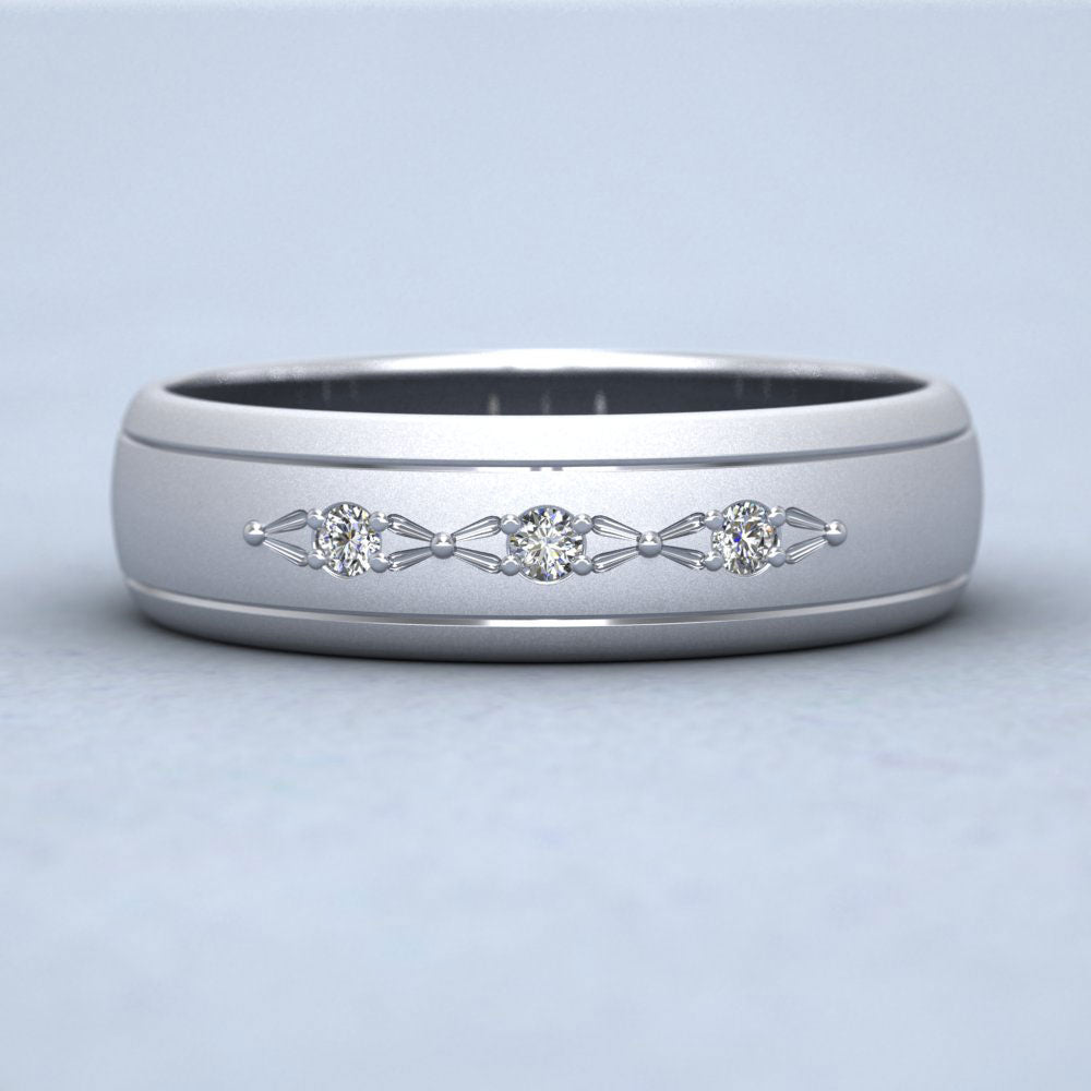 Three Diamond Set 18ct White Gold 6mm Wedding Ring With Lines